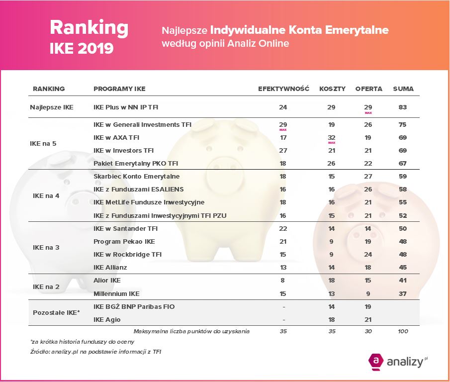 Ostatnie tygodnie w roku to często czas na wniesienie wpłat na konta emerytalne IKE i/lub IKZE, tak aby wykorzystać roczny limit (w 2019 roku w IKE wynosi 14 295 zł). Takie konta możemy założyć na przykład poprzez towarzystwa funduszy inwestycyjnych. W swojej ofercie IKE lub IKZE ma kilkanaście TFI. Jak co roku wzięliśmy je pod lupę i stworzyliśmy ranking. Zaczynamy od IKE!