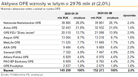 Dodatnie wyniki inwestycyjne wypracowane w lutym przyczyniły się do zwiększenia wartości aktywów zgromadzonych w OFE o 3,2 mld zł. Po odliczeniu ujemnego salda przepływu środków między OFE a ZUS, wzrost aktywów wyniósł niecałe 3,0 mld zł (2,0%). Na koniec miesiąca w OFE zgromadzone było 152,3 mld zł, czyli więcej niż pod koniec stycznia 2020 roku, czyli tuż przed wybuchem krachu na rynkach akcji wywołanego pandemią COVID-19.