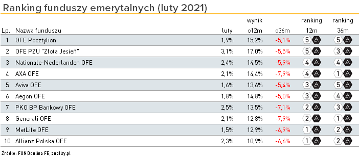 Nasz comiesięczny ranking OFE, oparty na wskaźniku mierzącym relację zysku do ryzyka (Information Ratio), otwiera ponownie Pocztylion OFE – fundusz, który otrzymuje najwyższe oceny szósty miesiąc z rzędu. Na drugie miejsce wskoczyło OFE PZU „Złota Jesień”, które dzięki najwyższemu wynikowi w lutym, ma także najwyższy wynik w skali 12 miesięcy (17,0%). Słabiej fundusz prezentuje się w dłuższym 3-letnim horyzoncie. Na przedostatnie miejsce spadło MetLife OFE, fundusz, który ponad pół roku temu znajdował się wśród najlepszych.