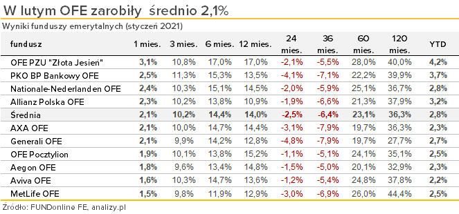 Dobra koniunktura na rynkach zagranicznych oraz w sektorze małych i średnich spółek pozytywnie przełożyła się na wyniki funduszy emerytalnych, których portfele wypełnione są akcjami (na koniec stycznia było to 86%). OFE zarobiły średnio 2,1%, a od początku roku 2,8%. Wszystkie fundusze wypracowały dodatnie stopy zwrotu, w tym najwyższą – OFE PZU „Złota Jesień” (+3,1%). Wszystkie fundusze odrobiły koronawirusowe straty z marca i kwietnia zeszłego roku.
