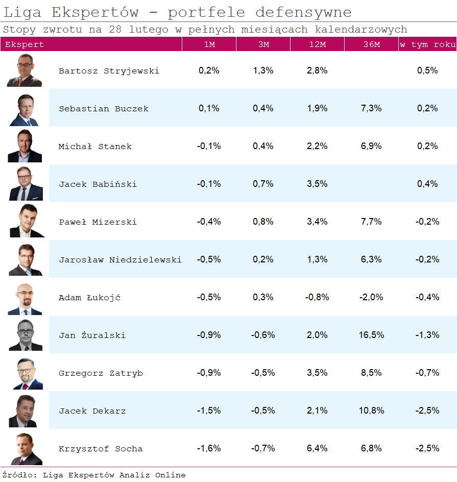 Na drugim biegunie wylądował Krzysztof Socha, który sparzył się na dwóch funduszach: Esaliens Globalnych Papierów Dłużnych oraz Esaliens Makrostrategii Papierów Dłużnych - ich straty wyniosły w lutym odpowiednio 2 i 6 proc. Portfel defensywny eksperta z Esaliens TFI zanotowałby pewnie jeszcze gorszy wynik, gdyby nie 10-proc. udział w funduszu Esaliens Małych i Średnich Spółek, który w ubiegłym miesiącu zarobił 10 proc.