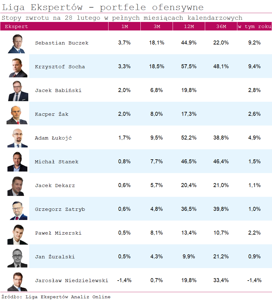 W lutym większość strategii ofensywnych zanotowała zyski. Koniunktura nie dopisała jedynie Jarosławowi Niedzielewskiemu z Investors TFI, który stracił 1,4 proc. Powodów można upatrywać w dywersyfikacji - jego portfel zbudowany jest z ośmiu funduszy, przy czym połowę zajmuje Investor Zrównoważony, który w lutym stracił 1,3 proc. Ekspert ma też relatywnie dużą ekspozycję na spółki technologiczne, które w ubiegłym miesiącu zostały mocno przecenione. Akcje takich firm znajdziemy zarówno w funduszu zrównoważonym, jak i w Investor Nowych Technologii oraz Investor Spółek Wzrostowych. Nie pomagał też fundusz Investor Gold, który stracił aż 8 proc.