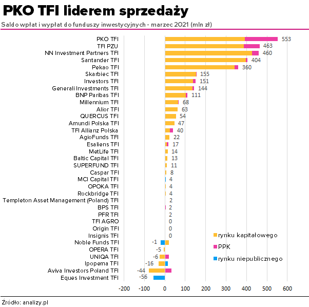 Podobnie jak w lutym, w marcu liderem sprzedaży zostało PKO TFI z niższym o połowę bilansem (prawie 0,6 mld zł). Na drugim miejscu znalazło się TFI PZU, a na trzecim NN Investment Partners TFI – lider sprzedaży z 2020 roku.