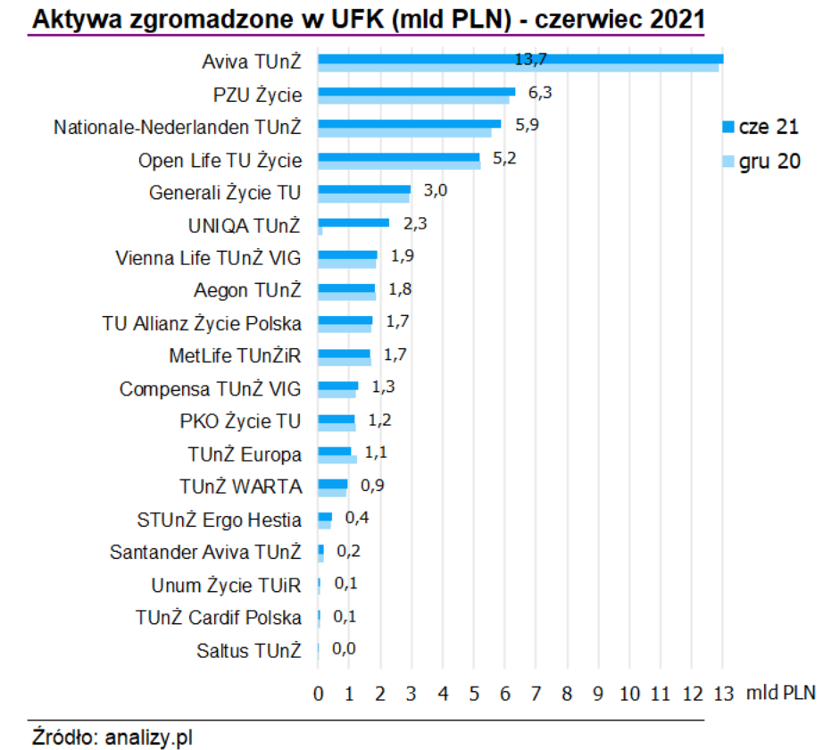 Przez pierwsze sześć miesięcy bieżącego roku pozycję lidera umocniła Aviva TUnŻ, która w polisach na życie UFK miała na koniec czerwca 2021 r. aż 13,7 mld zł (o 0,5 mld zł więcej niż w grudniu), co odpowiada 27,2 proc. rynku. Z drugiego miejsca podium nie schodzi też PZU Życie, które skoczyło na nie w grudniu. Od tego czasu aktywa towarzystwa wzrosły o ponad 0,3 mld zł.