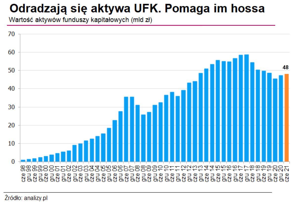 Pierwsza połowa 2021 r. przyniosła kontynuację odbicia w segmencie UFK. Dzięki sprzyjającej koniunkturze aktywa funduszy kapitałowych wzrosły w sześć miesięcy o 0,8 mld zł i na koniec czerwca sięgnęły niemal 48 mld zł.