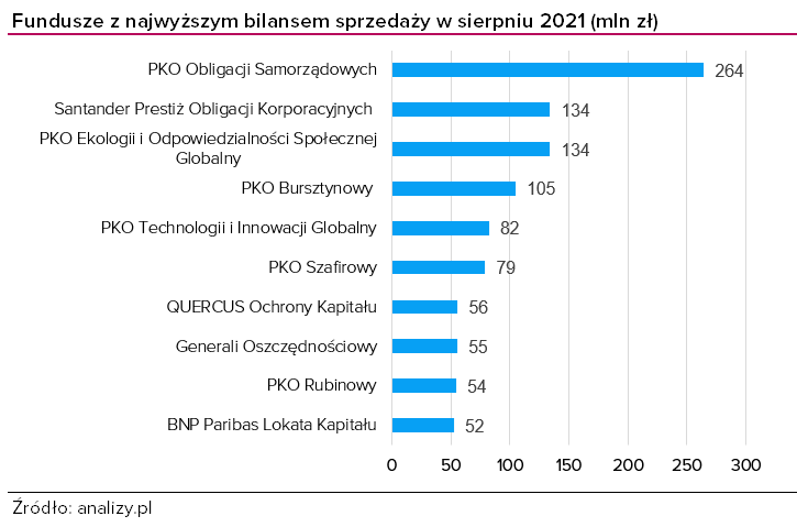 Z kolei napływ środków odnotowały fundusze obligacji korporacyjnych, do których trafiło 0,3 mld zł netto. Aż cztery fundusze z tej grupy znalazły się nawet wśród 10 najpopularniejszych funduszy w sierpniu: Santander Prestiż Obligacji Korporacyjnych, QUERCUS Ochrony Kapitału, Generali Oszczędnościowy oraz BNP Paribas Lokata Kapitału. Przewagę nabyć odnotowały także fundusze obligacji samorządowych, w tym bestseller z sierpnia PKO Obligacji Samorządowych (264 mln zł) oraz papierów zagranicznych, a wśród nich PKO Bursztynowy.