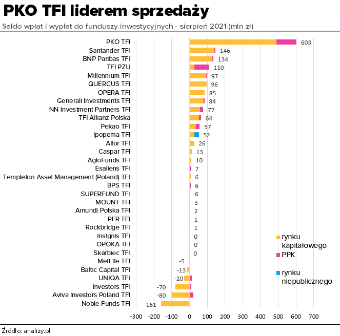 Kolejne 3 towarzystwa pozyskały w sierpniu po ponad 100 mln zł: Santander TFI, BNP Paribas TFI (jedno z najszybciej rozwijających się TFI w ostatnich latach) oraz PZU TFI (głównie dzięki PPK).