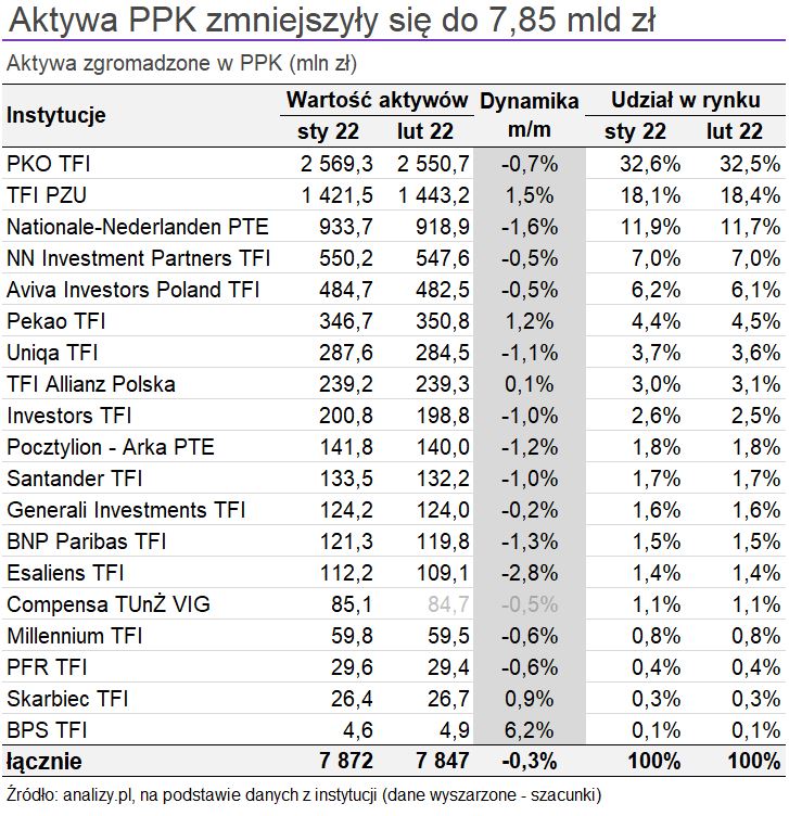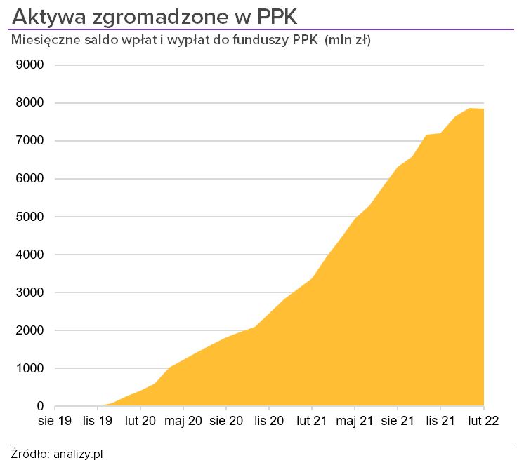 Mimo bardzo słabego miesiąca aktywa zgromadzone na kontach uczestników skurczyły się tylko o 25 mln złotych, czyli 0,3% wobec wzrostu w styczniu o niemal 220,5 mln złotych (niecałe 2,9%). Łącznie aktywa PPK po lutym wyniosły mniej niż 7,85 miliarda złotych wobec ponad 7,87 mld zł na koniec stycznia i 7,65 mld zł na koniec 2021 roku.
