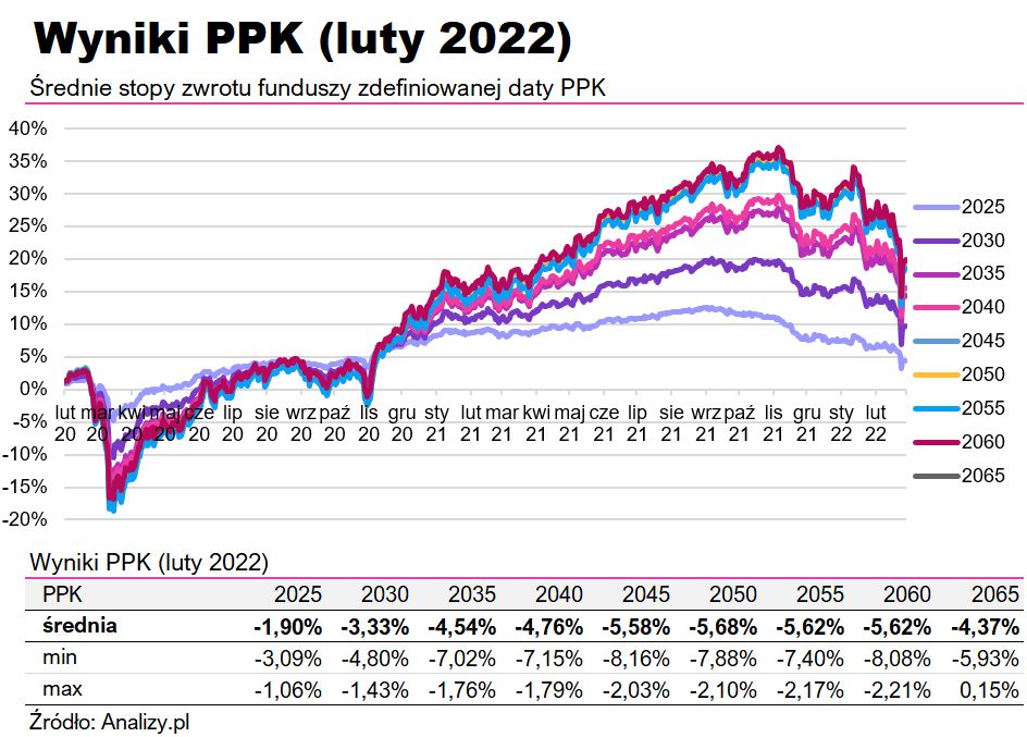 Jeszcze do sierpnia 2021 roku PPK miały dobrą passę (przypomnijmy, że ostatnia grupa firm przystąpiła do programu w pierwszym terminie do 10 maja). Od września jednak zaczęła się przeplatanka – raz wyniki PPK znajdowały się na minusie, raz na plusie. Po słabym wrześniu nadszedł dobry październik, potem fatalny listopad i całkiem dobry grudzień, który zakończył udany w sumie rok. Styczeń znowu był słaby, ale i tak wypadł dobrze w porównaniu z lutym, kiedy to spadki były dużo głębsze.