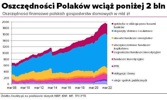 Kategorią oszczędności, która odnotowała wzrost w I kwartale 2022 roku i to solidny, była natomiast gotówka. Na koniec marca jej wartość w portfelach gospodarstw domowych wyniosła aż 372 mld zł – o 32 mld zł więcej niż na koniec 2021 roku (+9%). To głównie efekt paniki wywołanej wybuchem wojny w Ukrainie i wzrostem zapotrzebowania na gotówkę.