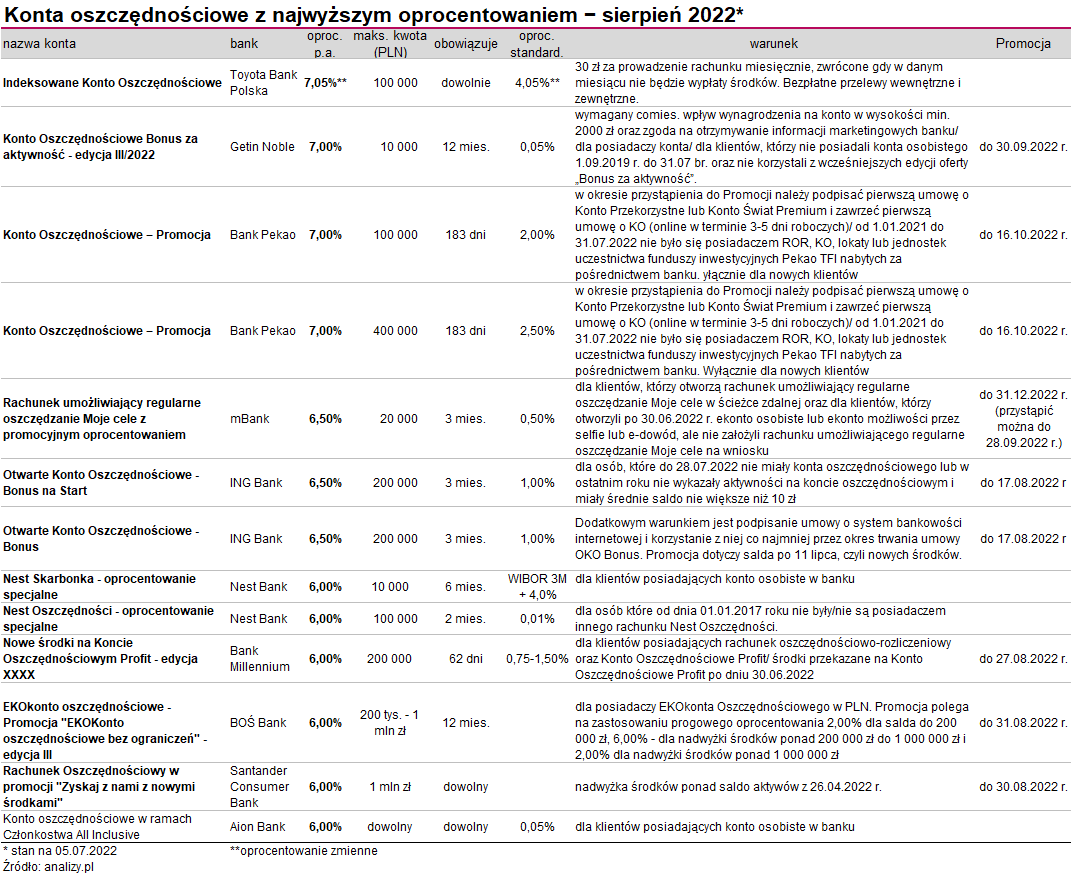 Na pierwszym miejscu od lipca pozostało konto oferujące 7,05% w skali roku przez Toyota Bank. Mowa o Indeksowanym Koncie Oszczędnościowym, koncie, które ma zmienne oprocentowanie, aktualizowane co kwartał, oparte na stawce WIBOR 3M z przedostatniego dnia minionego kwartału. Przez najbliższe trzy miesiące wspomniane oprocentowanie jest więc gwarantowane.