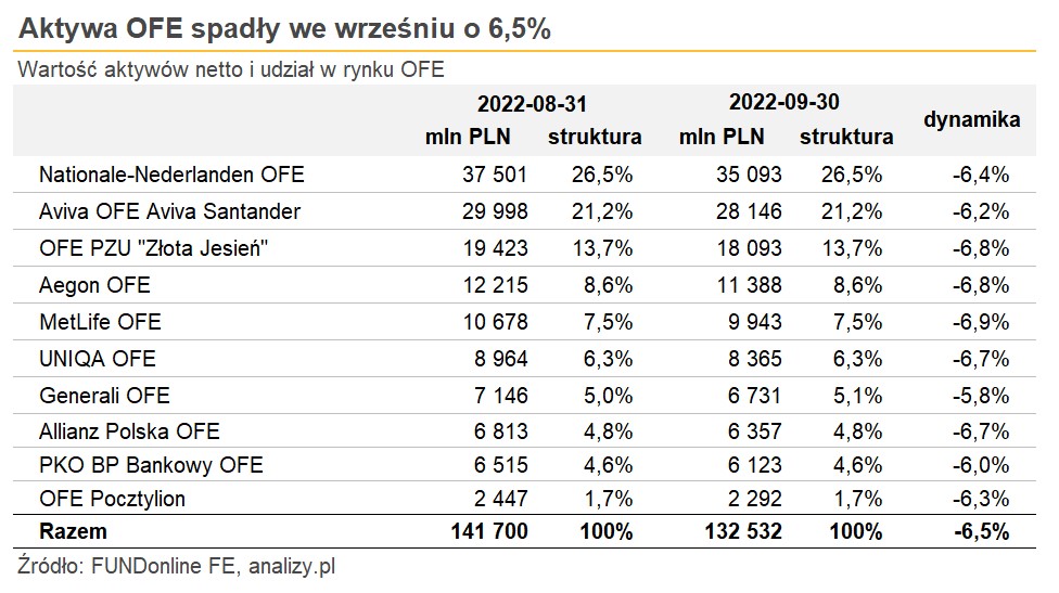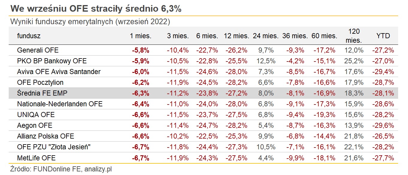 Wrzesień był dla OFE kolejnym spadkowym miesiącem, choć zarówno pod względem wyników, jak i zmiany aktywów, nieco lepszym od sierpnia. Aktywa zmniejszyły się o 6,5%, czyli o nieco ponad 9 mld zł.