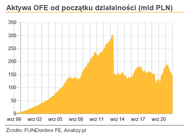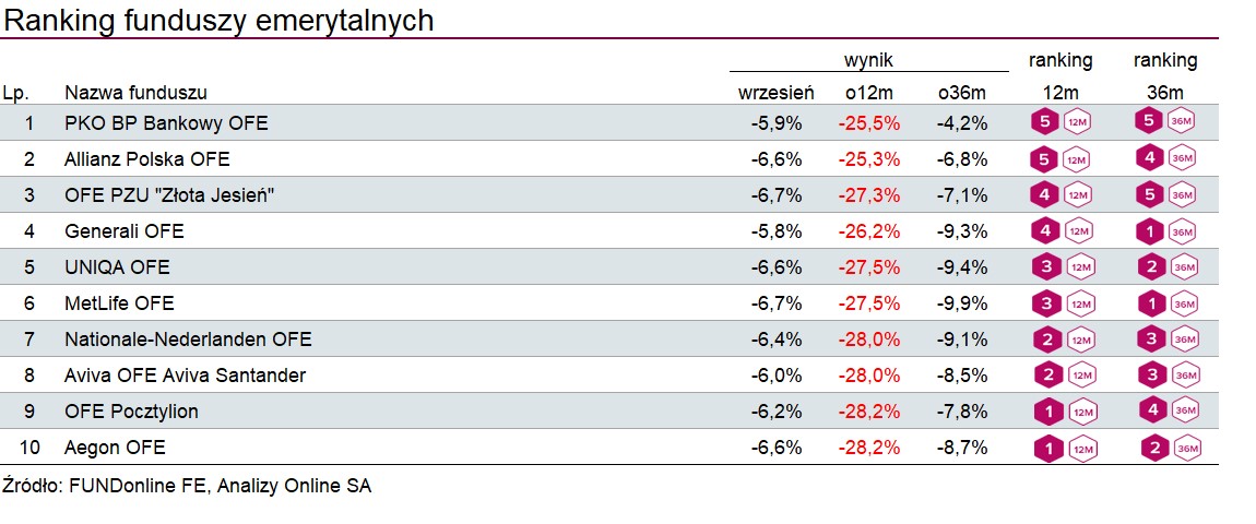 W takim otoczeniu warszawskie indeksy nie miały szans. WIG20 okazał się jednym z najsłabszych głównych indeksów na świecie, spadając poniżej poziomu 1400 punktów, a indeks szerokiego rynku WIG stracił w ciągu trzech kwartałów niemal 34%. Złoty słabł, zwłaszcza że w przeciwieństwie do Fedu i EBC polska RPP przyjęła bardziej gołębi ton, sugerując schyłek cyklu podwyżek lub przynajmniej przystanek w nich. Nic dziwnego, że OFE, zaangażowane głównie w polskie spółki, nie mogły w tych warunkach odnotować dobrych wyników.