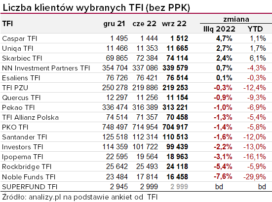Już ponad 12 miesięcy trwa odpływ środków z funduszy inwestycyjnych. Towarzyszy mu także odpływ klientów. Są jednak TFI, dla których ostatni kwartał był udany. W III kwartale pięć TFI powiększyło liczbę klientów (bez pomocy PPK). W największym stopniu jedno z mniejszych TFI — Caspar TFI — o 4,7% do 1,5 tys. osób na koniec września. To był dobry kwartał także dla Uniqa TFI oraz Skarbca TFI - w obu przypadkach liczba standardowych klientów powiększyła się o ponad 2% odpowiednio do 11,7 tys. osób i 74 tys. osób. Oba te towarzystwa oferują PPK, ale to Uniqa TFI odnotowała wyższy wzrost liczby klientów ogółem (z PPK jest to 127,8 tys. klientów — czyli ponad 10-krotnie więcej niż bez PPK).