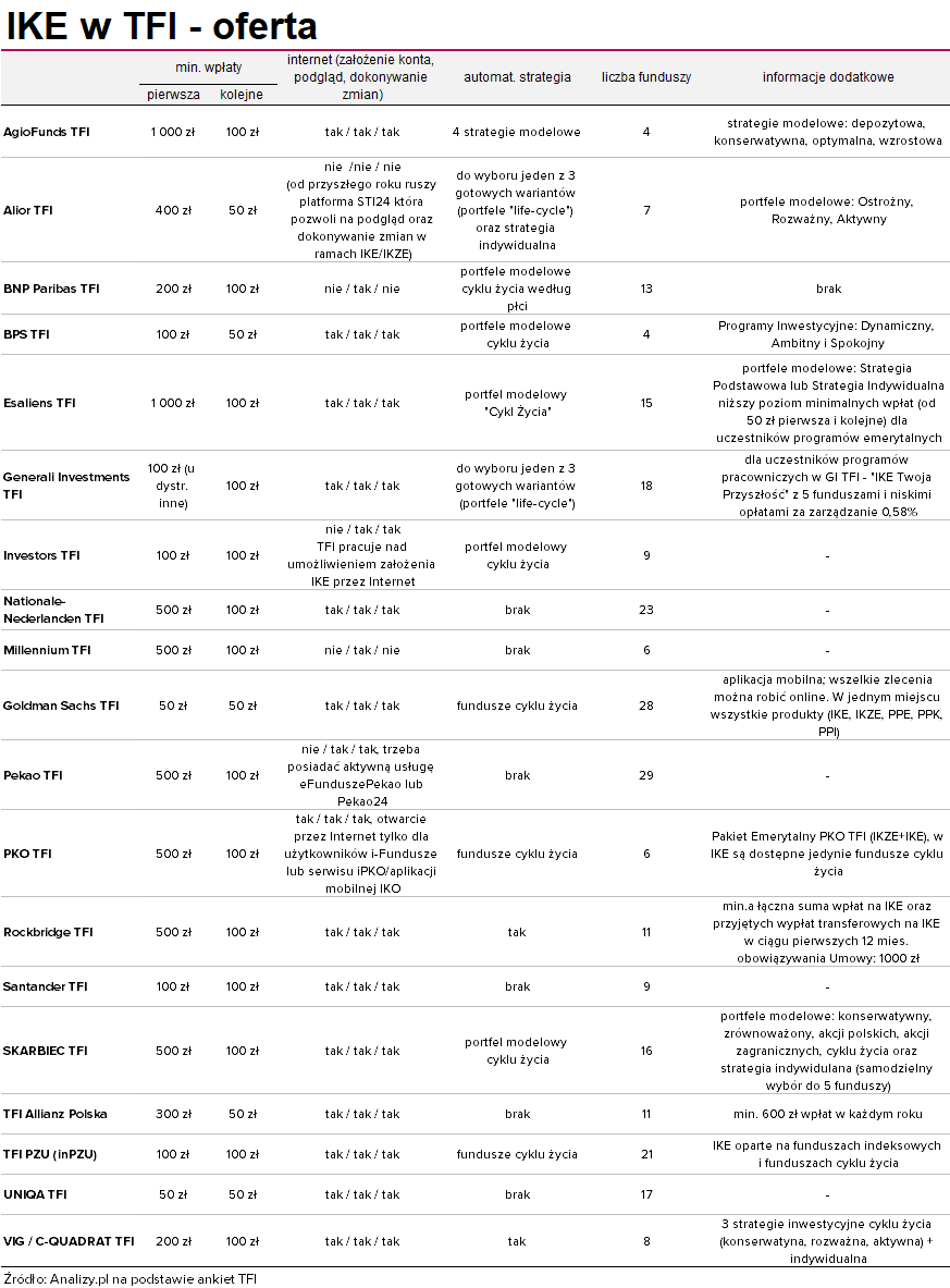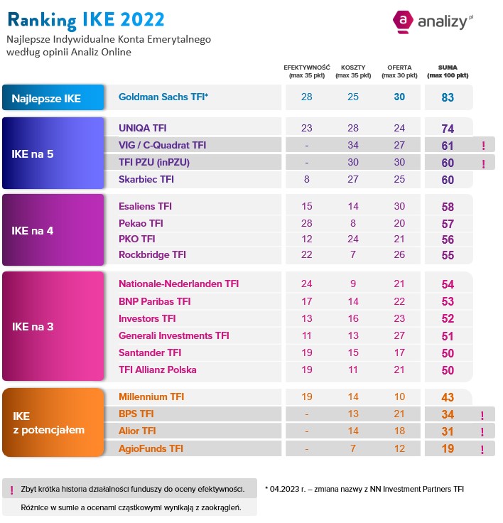 W tej kategorii sumarycznie najwięcej punktów otrzymało IKE w Goldman Sachs TFI oraz Pekao TFI (po 28 punktów). W obu przypadkach to zasługa głównie dobrze radzących sobie funduszy dłużnych, mieszanych czy akcji globalnych; fundusze akcji polskich otrzymały nieco gorsze noty. Najwięcej punktów w kategorii funduszy akcji polskich otrzymało UNIQA TFI, w kategorii funduszy papierów dłużnych długoterminowych – Rockbridge TFI, a dłużnych skarbowych krótkoterminowych TFI PZU.