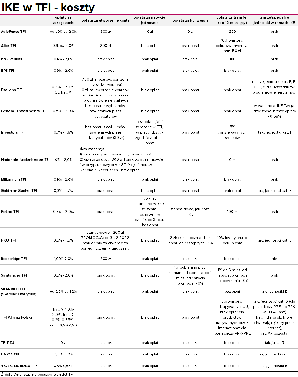 Podobną sytuację mamy w przypadku opłat za uruchomienie IKE. W części TFI zawsze jest to bezpłatne, ale są TFI, które taką opłatę pobierają, a np. zwalniają z niej klientów innych programów emerytalnych (PPE czy PPK). To tylko pokazuje, jak złożona jest analiza IKE z funduszami.