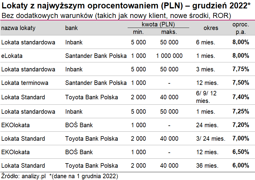 Dwa z nich nie stawiają klientom żadnych warunków, takich jak konieczność posiadania czy założenia konta lub zdeponowania nowych środków. Mowa o Lokacie standardowej na sześć miesięcy w Inbanku oraz miesięcznej eLokacie w Santanderze Banku Polska. Żeby skorzystać z pierwszej z nich, trzeba mieć od 5 do 50 tys. zł, z drugiej – od tysiąca do miliona zł, ale ta oferta jest aktualna tylko do 12 grudnia. Poniżej tabela lokat o najwyższym oprocentowaniu bez dodatkowych warunków.