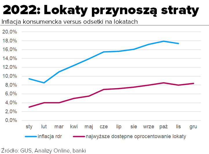 W listopadzie po raz pierwszy od czasu wprowadzenia tarczy antinflacyjnej inflacja spadła, czyli ceny rosły wolniej niż miesiąc wcześniej. Najwyższe oprocentowanie lokat natomiast lekko wzrosło po niewielkim spadku w listopadzie. Do inflacji nadal mu daleko, zawsze jednak pozwala na ochronę chociaż części wartości posiadanych pieniędzy.
