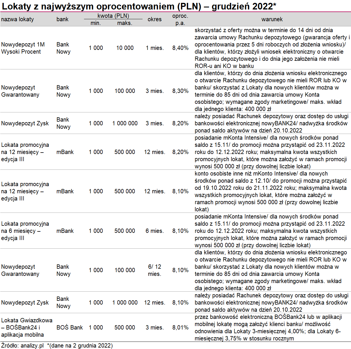 Z najwyższym do tej pory oprocentowaniem lokaty mieliśmy do czynienia w październiku, gdy Bank Nowy proponował nowym klientom 8,50% w skali roku na miesięcznym (niestety tylko) Nowymdepozycie Wysoki Procent. Miesiąc później odsetki były już o punkt procentowy niższe, by teraz wzrosnąć do 8,40%. Wystarcza to do zajęcia pierwszego miejsca w zestawieniu. Lokata jest przeznaczona dla nowych klientów (promocja obowiązuje przez 14 dni od założenia konta) i przez miesiąc oferuje 8,40% w skali roku dla kwot od tysiąca do 10 tys. zł. W najlepszym wypadku po miesiącu i po odprowadzeniu podatku otrzymamy więc 57 zł.