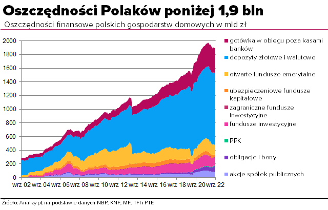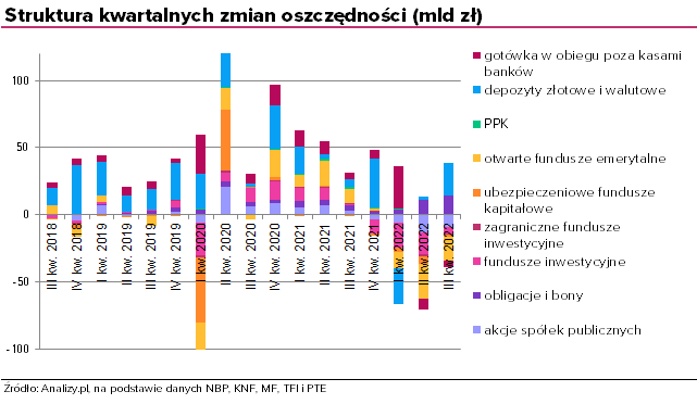 Po bardzo trudnym drugim kwartale 2022, w którym oszczędności gospodarstw skurczyły się o ok. 57 mld zł, w trzecim kwartale utrzymały się na podobnym poziomie – 1,89 bln zł. To z jednej strony efekt niższych spadków na rynkach kapitałowych (na rynku długu można było nawet zarobić), a co za tym idzie niższej dynamiki spadku aktywów zgromadzonych w większym lub mniejszym stopniu na rynkach akcji. Z drugiej strony wyraźnie wzrosło zainteresowanie lokatami i obligacjami oszczędnościowymi.