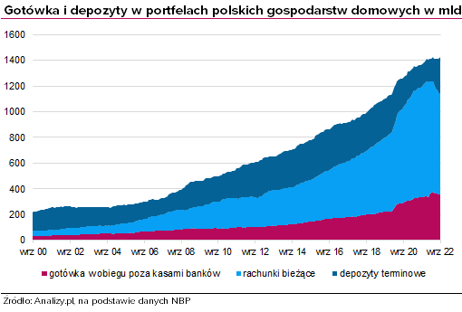 Już od blisko roku obserwujemy powrót Polaków do mniej płynnych, ale wyżej oprocentowanych form oszczędzania. Miesiąc w miesiąc rośnie wartość środków ulokowanych na depozytach terminowych, od maja po co najmniej kilkanaście mld zł. W trzecim kwartale tego roku wartość depozytów gospodarstw domowych wzrosła o rekordowe 57 mld zł do 283 mld zł na koniec września. Dla porównania rok wcześniej na lokatach w bankach i SKOK-ach trzymaliśmy 172 mld zł (to skok aż o 65% rok do roku). Część środków pochodzi z nisko oprocentowanych rachunków bieżących. Tylko w trzecim kwartale ubyło z nich prawie 33 mld zł, a wciągu roku ponad 75 mld zł.
