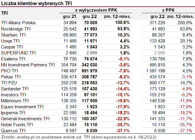 W zeszłym roku najlepiej wypadły te towarzystwa, które brały udział w akwizycji. Allianz Polska TFI przejęło Aviva Investors TFI, dzięki czemu odnotowało wzrost liczby klientów o 100%, a z uwzględnieniem PPK nawet trzykrotny. W pierwszym ujęciu utrzymało 11. pozycję na rynku z 70 tys. klientów, natomiast dołączając posiadaczy PPK, wskoczyło na 5. pozycję.