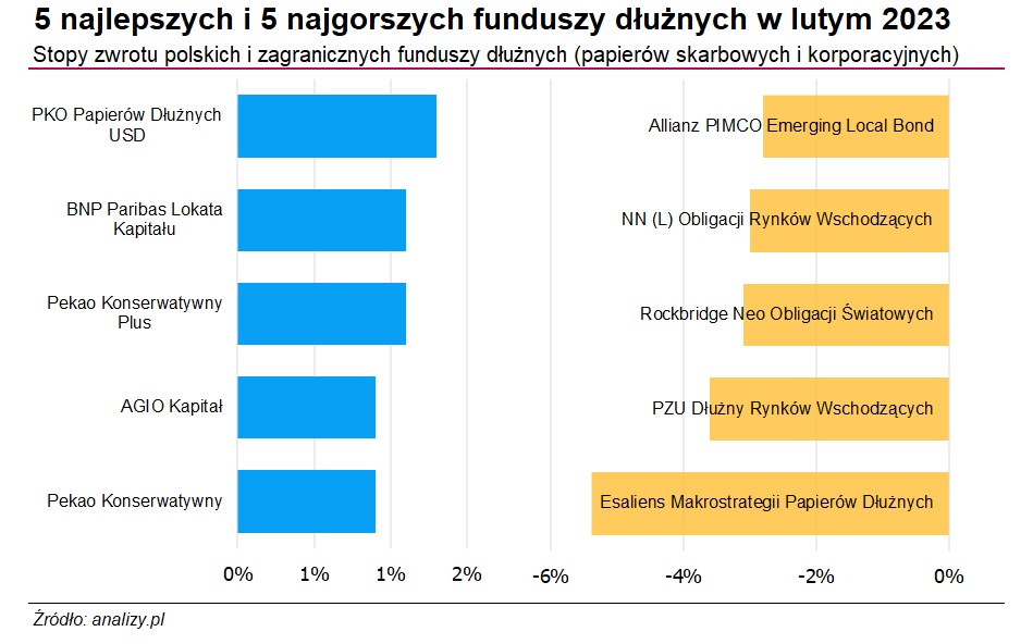 W górę poszła też wycena docelowego poziomu stóp procenowych zarówno w Stanach, jak i w strefie euro. Rynki zakładają obecnie, że stopa EBC wzrośnie do 4 proc. i utrzyma się na tym poziomie do lutego 2024 r. W USA oczekiwania przesunęły się na 5,50-5,75 proc., co oznacza łącznie jeszcze 4 podwyżki w tym roku (po 25 pkt baz). W rezultacie spośród 220 funduszy dłużnych polskich i zagranicznych (papierów korporacyjnych i skarbowych), na plusie w lutym było jedynie 90. Najlepiej poradziły sobie fundusze obligacji skarbowych o niskim duration oraz te, które inwestują w zmiennokuponowe papiery przedsiębiorstw.