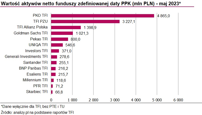Maj sprzyjał również funduszom zdefiniowanej daty PPK, które są systematycznie zasilane wpłatami pracowników i pracodawców. Wartość zgromadzonych w nich środków zwiększyła się w ubiegłym miesiącu o ponad 475 mln zł (+3,7 proc.), do niemal 13,5 mld zł. Ich udział w rynku wynosi 4,7 proc.