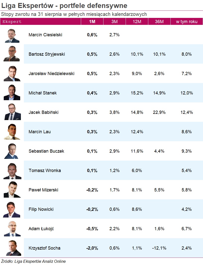 Po 0,5 proc. zarobili w ubiegłym miesiącu także Bartosz Stryjewski z BPS TFI oraz Jarosław Niedzielewski z Investors TFI. Ten pierwszy ma w portfelu 3 zyskujące w sierpniu fundusze: BPS Konserwatywny (+0,6 proc.), BPS Spokojna Inwestycja (+0,7 poc.) oraz BPS Obligacji (+0,3 proc.). W portfelu drugiego specjalisty też są 3 fundusze (Investor Bezpiecznego Wzrostu, Investor Obligacji oraz Investor Oszczędnościowy), których zyski sięgnęły w sierpniu od 0,1 do 0,7 proc.