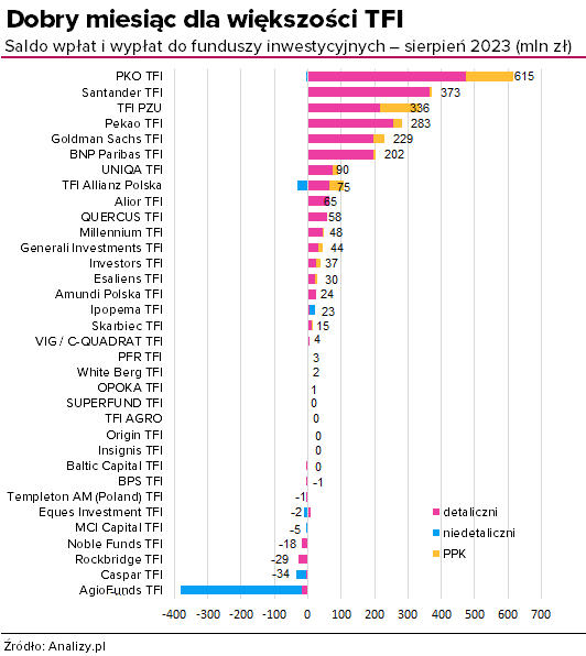 - Podobnie jak w lipcu najwięcej nowych środków pozyskało PKO TFI (615 mln zł), które dopiero od marca br. notuje dodatni bilans sprzedaży, każdego miesiąca coraz wyższy.