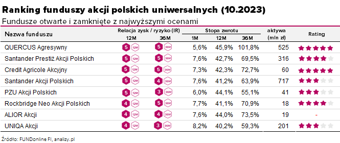 Obecnie w ofercie TFI mamy ponad 40 funduszy akcji polskich uniwersalnych. W tabeli prezentujemy te, które w najnowszym październikowym rankingu otrzymały wysokie oceny w pięciopunktowej skali (4a lub 5a) w 12-miesięcznym horyzoncie oraz co najmniej 3a w horyzoncie 3-letnim.