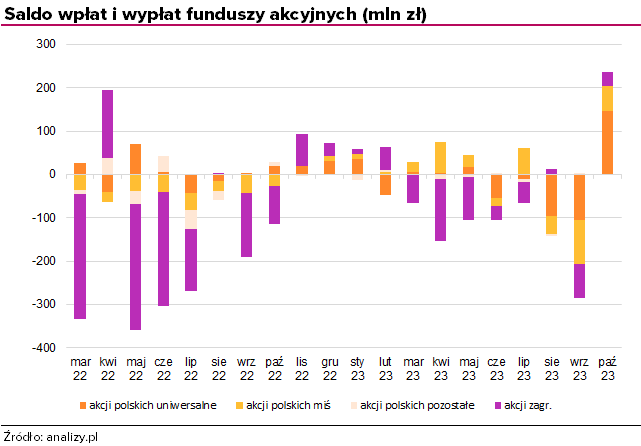 Z pozostałych segmentów najlepiej poradziły sobie fundusze akcyjne (zarówno akcji polskich jak i zagranicznych), do których klienci wpłacili 235 mln zł. Wśród nich najwięcej pieniędzy trafiło łącznie do funduszy akcji polskich o uniwersalnej strategii (146 mln zł), wśród których brylował QUERCUS Agresywny z 61 mln zł. Fundusze akcji małych i średnich spółek także miały przewagę wpłat, na poziomie 58 mln zł. W tej grupie liderem sprzedaży został Generali Akcje Małych i Średnich Spółek z 21 mln zł. Najmniej nowego kapitału pozyskały fundusze akcji zagranicznych (33 mln zł), a wśród nich Skarbiec Spółek Wzrostowych. Wysokie opływy, podobnie jak we wrześniu, odnotował natomiast PKO Technologii i Innowacji Globalny (-26 mln zł) - lider w całym segmencie z 2,5 mld zł aktywów.