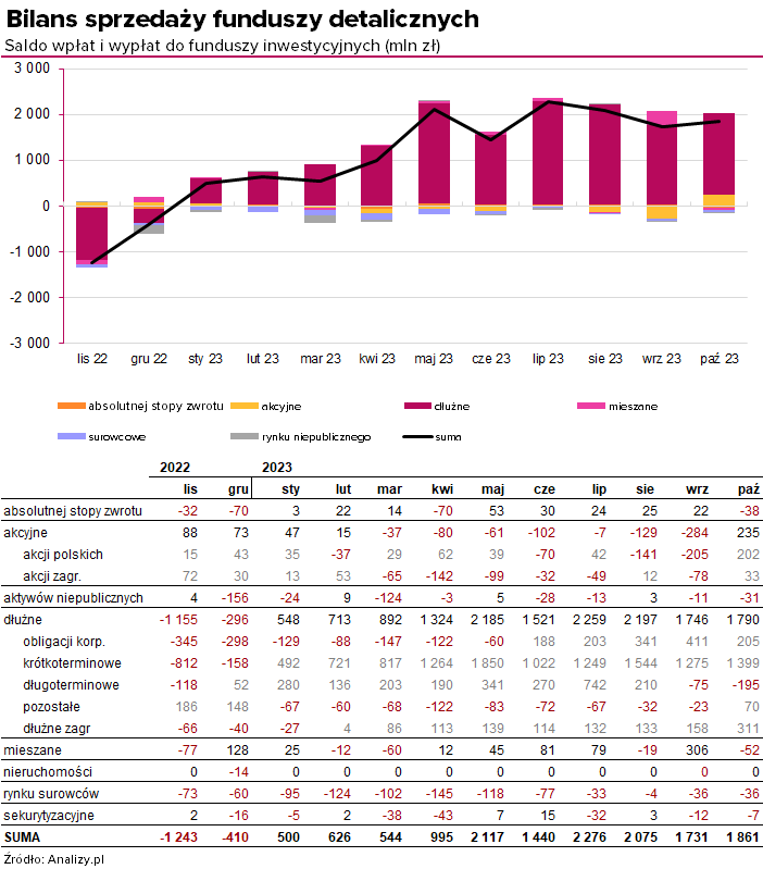 Nic się nie zmieniło, jeśli chodzi o konia pociągowego tegorocznej sprzedaży. Wciąż królują fundusze dłużne, które w październiku pozyskały netto 1,8 mld zł. To, co nas natomiast cieszy, to rysujący się powrót klientów do funduszy akcyjnych. Skala napływu może nie była bardzo wysoka (238 mln zł), ale to najwyższa wartość od 22 mies.