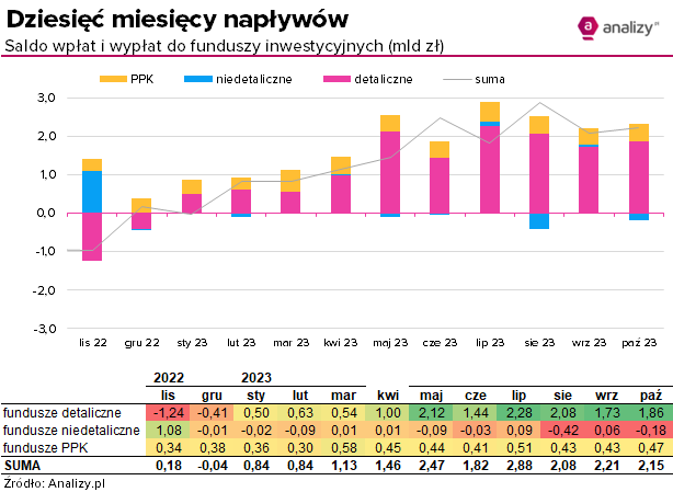 Saldo wpłat i wypłat do funduszy inwestycyjnych (październik 2023)