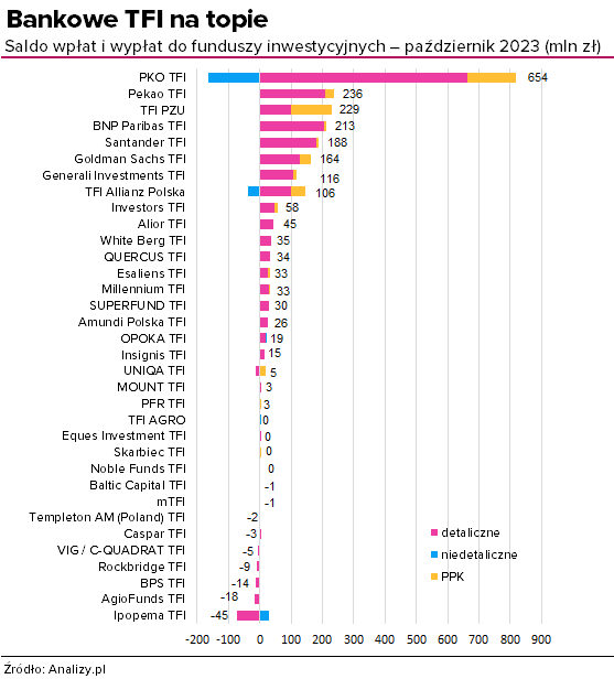 W zestawieniu wg TFI w październiku zdecydowanym liderem sprzedaży zostało PKO TFI z ponad 0,65 mld zł nowych środków (czwarty miesiąc z rzędu), i to mimo sporego odpływu środków z jednego z funduszy dedykowanych. Na drugim miejscu z 236 mln zł znalazło się Pekao TFI. Pierwszą trójkę zamyka TFI ubezpieczeniowe PZU TFI, które bryluje w segmencie PPK.
