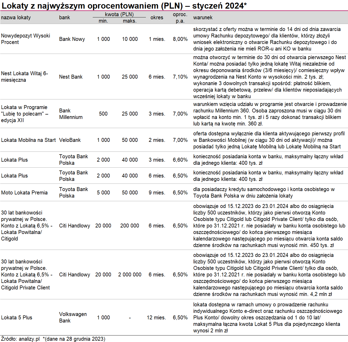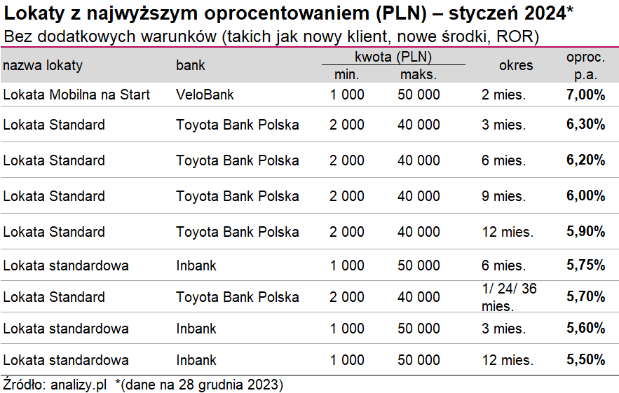 Przed miesiącem 7% w skali roku oferował na dwóch produktach bank Citi Handlowy. Jednak w grudniu oprocentowanie sapdło o pół punktu procentowego, a nowe edycje jubileuszowej promocji w bankowości przesunęły się ku dołowi tabeli. Wyprzedziła je Lokata Plus Toyota Banku Polska na trzy miesiące. Natomiast poza pierwszą dziesiątką znalazł się w tym miesiącu Nowydepozyt Gwarantowany na trzy miesiące w Banku Nowym (tylko dla nowych klientów), który obniżył stawkę do 6,30% w skali roku z 6,50%. Podobnie stało się z Lokatą na Start w Inbanku, również trzymiesięczną. To odsetki zmniejszyły się do 6,25% rocznie z 6,75% na początku grudnia.