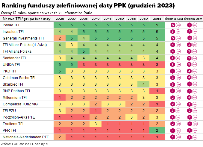 W rankingu funduszy PPK w porównaniu z listopadem nie zmieniło się podium ani dół tabeli; przetasowania nastąpiły w jego środkowej części. Niezmiennie prym wiedzie Pekao TFI z dwiema maksymalnymi ocenami (horyzont roczny i trzyletni), a za nim znajdują się Investors TFI i Generali Investments TFI. Wszystkie zachowały punktację sprzed miesiąca. W dół przesunęły się Uniqa TFI i PKO TFI, których oceny w ujęciu rocznym spadły z "4" do "3". W odwrotną stronę powędrowała za to nota dawnej Avivy (TFI Allianz Polska), dając jej awans z ósmego na czwarte miejsce.