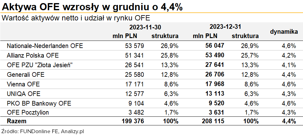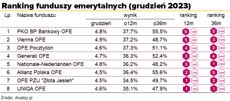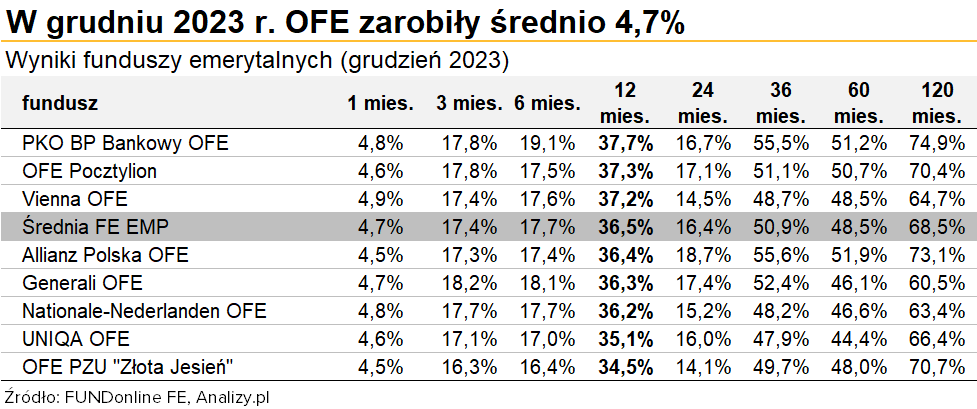 W grudniu najlepszy wynik osiągnęło Vienna OFE, które wypracowało 4,9%. Na drugim miejscu znalazły się ex auequo PKO BP Bankowy OFE i Nationale-Nederlanden OFE (po 4,8%). Stosunkowo najsłabiej, choć trudno uznać to za zły rezultat, a różnice są minimalne, wypadły Allianz Polska OFE i OFE PZU „Złota Jesień”, które zarobiły po 4,5%.