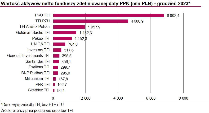 Ogromny wzrost aktywów, bo o niemal 1,2 mld zł (+6,5 proc.) odnotowały w grudniu również fundusze zdefiniowanej daty PPK – systematycznie zasilane wpłatami pracowników i pracodawców. W całym 2023 r. wartość zarządzanych środków wzrosła o 8,6 mld zł i na koniec roku wyniosła 18,9 mld zł. Ich udział w rynku wzrósł z kolei do 5,9 proc.