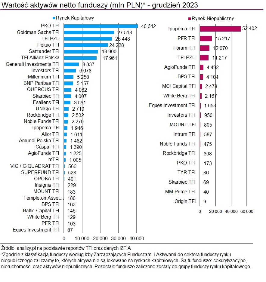 Niezmiennie najwięcej aktywów netto w segmencie rynku kapitałowego ma pod zarządzaniem PKO TFI (40,6 mld zł). Na drugim miejscu jest Goldman Sachs TFI, które posiada ponad 27,5 mld zł. Na rynku niepublicznym liderem pozostaje Ipopema TFI (52,4 mld zł).