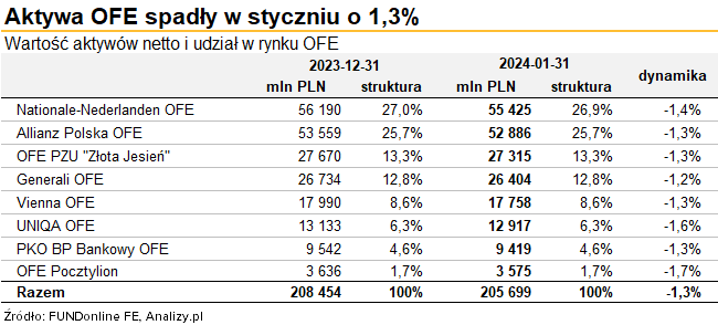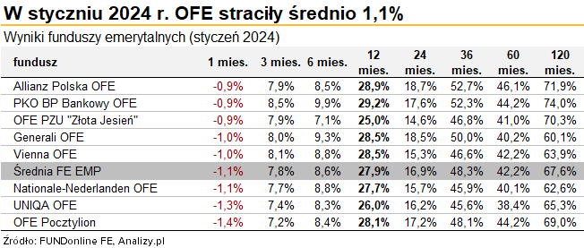 OFE, które 80% aktywów mają ulokowane w akcjach krajowych spółek, po bardzo dobrym ostatnim kwartale 2023 roku, kiedy to zarobiły dobrze ponad 30 mld złotych, w styczniu poniosły lekką stratę w wysokości 2,1 mld złotych. Oznacza to spadek o 1,1%, czyli wyraźnie mniejszy niż WIG20 i nieco niższy niż szerokiego rynku.