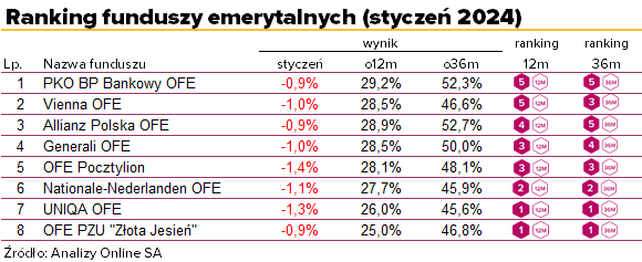W styczniu najlepiej poradziły sobie trzy OFE: Allianz Polska OFE, PKO BP Bankowy OFE oraz OFE PZU Złota Jesień. Wszystkie straciły po 0,9%. Niewiele słabsze okazały się Generali OFE oraz Vienna OFE (-1,0%). Na dole tabeli znalazły się OFE Pocztylion (-1,4%) oraz UNIQA OFE (-1,3%).