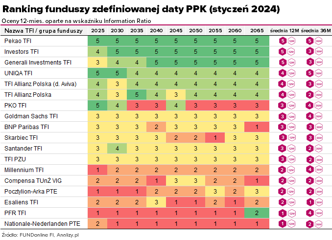 Pod względem relacji wyników do ryzyka (opieramy się na wskaźniku Information Ratio) zdecydowanym liderem pozostaje jednak Pekao TFI - zwycięzca naszego rankingu. Fundusze tego towarzystwa od wielu miesięcy utrzymują najwyższe noty 5a zarówno w 12-mies., jak i 36-mies. Zresztą w tym dłuższym horyzoncie osiągnęły także najwyższe wyniki ze wszystkich PPK.