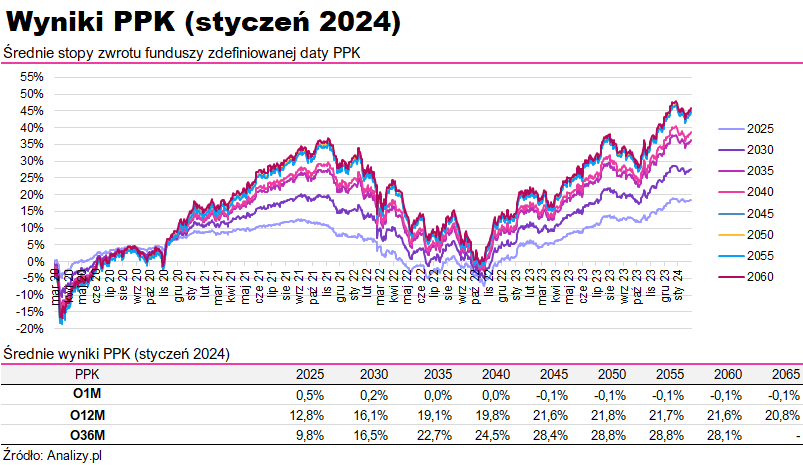 W styczniu wyniki funduszy zdefiniowanej daty oferowanych w ramach PPK (w skrócie zwanych funduszami PPK) były bardzo do siebie zbliżone – zawarły się w przedziale od -0,6% do +0,8%. Przy czym niewielki zysk wypracowała ponad połowa z nich. Generalnie lepiej poradziły sobie fundusze w mniejszym stopniu oparte na akcjach, czyli te z bliższą datą docelową. Fundusze PPK 2025 wypracowały średnio +0,46%, a fundusze PPK 2030 +0,2%. Fundusze z datą 2040-2065 zakończyły miesiąc średnio z wynikiem -0,1%.