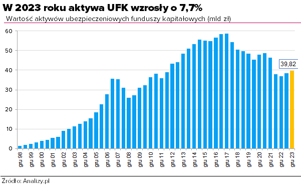 Po kilku latach malejącego rynku UFK, w 2023 roku aktywa zgromadzone w ubezpieczeniowych funduszach kapitałowych wzrosły o prawie 3 mld zł. To zasługa świetnej koniunktury na rynkach w zeszłym roku. Saldo wpłat i wypłat od kilku lat jest ujemne i 2023 rok nie zmienił tej tendencji.