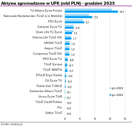 Pod względem wartości aktywów liderem rynku od 2022 roku jest TU Allianz Życie Polska, które przejęło Aviva TUnŻ – wcześniejszego lidera. Ubezpieczyciel odnotował wzrost aktywów o prawie 1,7 mld zł (13%), dzięki czemu jeszcze wzmocnił swą pozycję z 35,4% udziałem w rynku.
