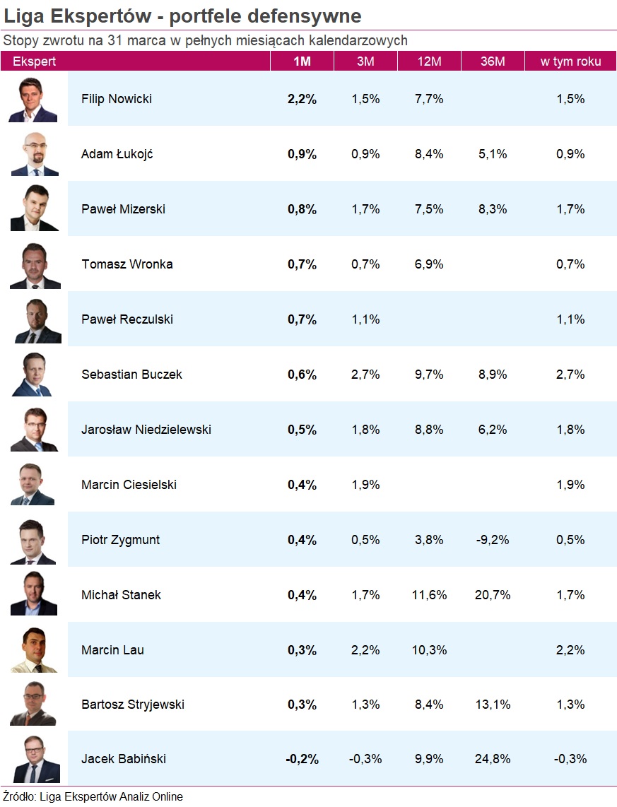Najgorzej w ubiegłym miesiącu wypadł Jacek Babiński. Jego portfel defensywny zbudowany jest tylko z jednego funduszu - Pekao Dłużny Aktywny - który w marcu stracił 0,2 proc. Był to już kolejny spadkowy miesiąc dla tego uczestnika. W lutym strategia defensywna Jacka Babińskiego straciła 0,6 proc.