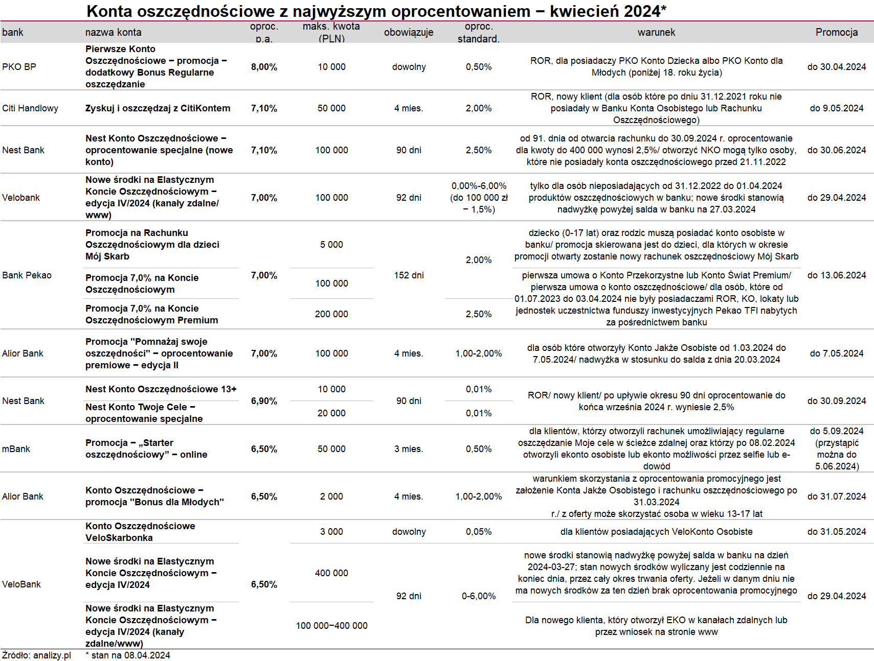 Ranking kont oszczędnościowych w kwietniu 2024 roku otwiera (niezmiennie od października 2023 r.) jedyny obecnie rachunek oszczędnościowy oferujący 8% w skali roku. Jego dostępność jest jednak ograniczona. Jest to bowiem konto dostępne wyłącznie dla dzieci i młodzieży przed ukończeniem 18. roku życia. Mowa o Pierwszym Koncie Oszczędnościowym – promocja – dodatkowy Bonus Regularne oszczędzanie w banku PKO BP. W obecnej edycji oprocentowanie to obowiązuje do końca kwietnia, ale może zostać przedłużone.