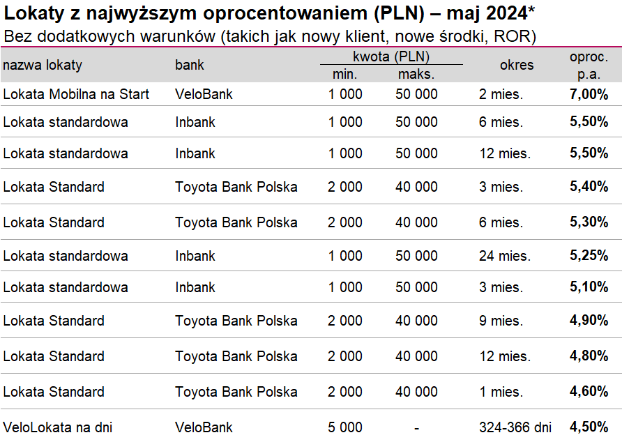 W porównaniu z kwietniem w rankingach lokat nastąpiły pewne przetasowania. Najbardziej uatrakcyjnił ofertę Inbank, który dwukrotnie podniósł oprocentowanie na niektórych depozytach niestawiających żadnych warunków. Na dwukrotną zmianę warunków na korzyść klienta zdecydował się także Toyota Bank; tam jednak trzeba mieć rachunek osobisty.