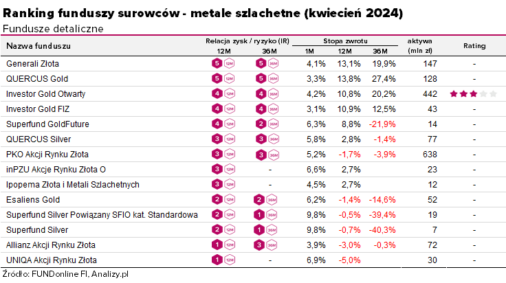 W kwietniowym rankingu najwyższą ocenę 5a w horyzoncie rocznym i trzyletnim uzyskały dwa fundusze: Generali Złota oraz QUERCUS Gold. O jedno oczko słabsze noty otrzymał Investor Gold Otwarty . Ich portfele są wypełnione instrumentami dającymi bezpośrednią lub pośrednią ekspozycję na cenę złota, dzięki czemu ich wyniki są zbliżone do notowań kruszcu. W pierwszym są to głównie ETC i ETF-y, w drugim kontrakty na złoto (oraz obligacje korporacyjne), a w Investor Gold Otwarty - tytuły uczestnictwa zagranicznych funduszy (ETF i ETC) dających ekspozycję na rynek metali szlachetnych.